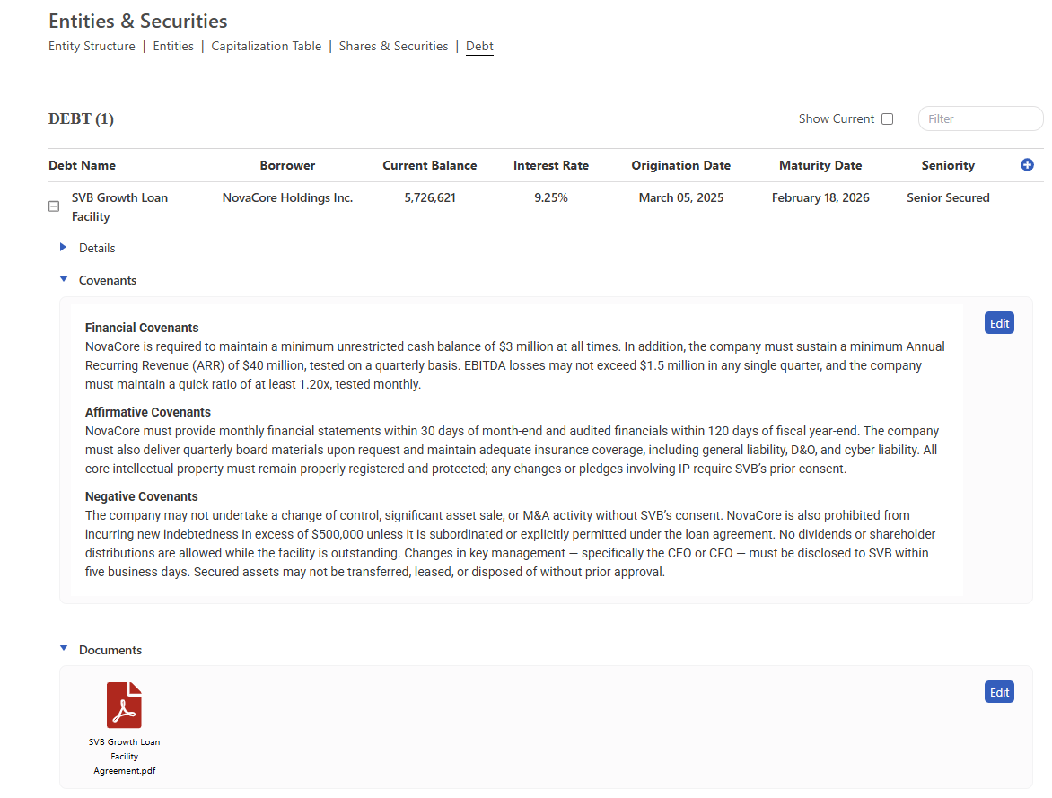 View all debt details across entities in one place. Assist with planning your strategic growth capital needs while staying compliant with covenants and agreements.