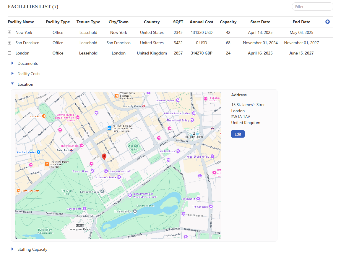 Maintain a centralized view of all your facilities, with visibility into lease terms, upcoming expiries, and location-specific costs, supporting smarter operational and footprint planning.