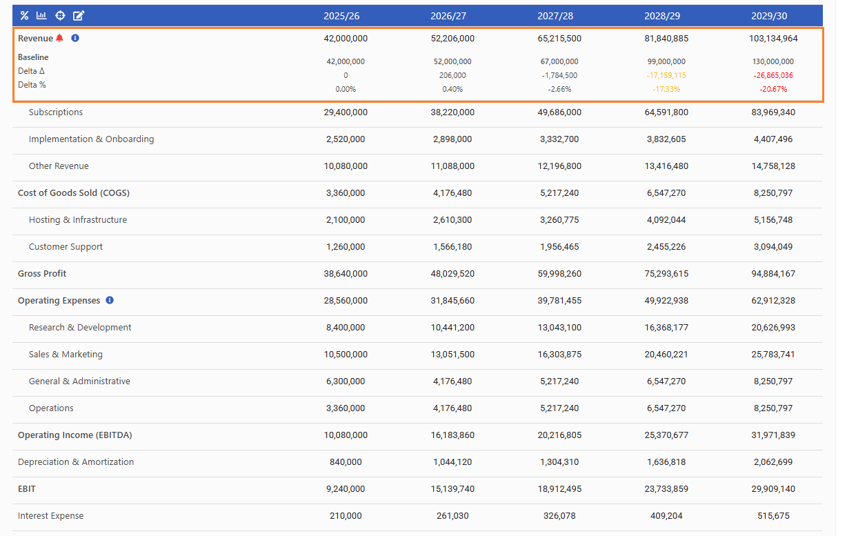 When progress slips, linked Success Visions and baselines are highlighted so you can quickly spot issues. Set custom alert thresholds to stay ahead and keep your growth on course.
