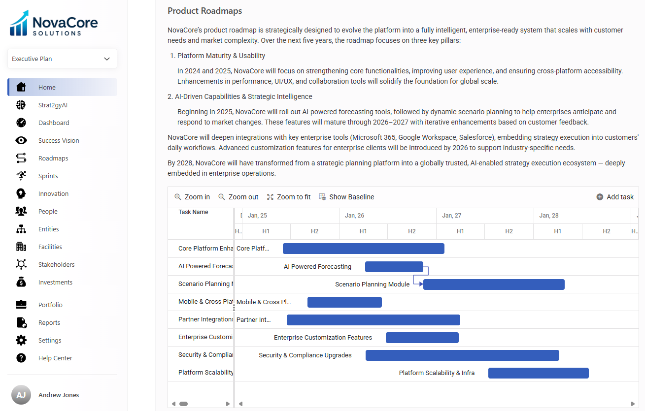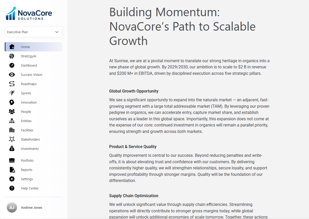 At its core, the platform is feature-rich and designed to bring strategy and execution together in one seamless, integrated solution. With Strat2gyAI, every function of the business is connected, from planning and operations to finance, marketing, and beyond. Teams can collaborate in real time, share ideas, and align around common objectives, ensuring that energy is focused on what drives results. By turning strategy into a living, actionable framework, the platform empowers companies to move faster, work smarter, and build a culture of innovation and accountability.