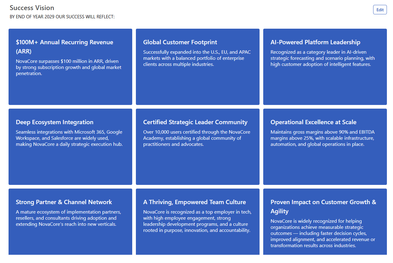 Use Success Visions to define what winning looks like for your business. Shape a clear, inspiring future that aligns your team and drives strategic focus.