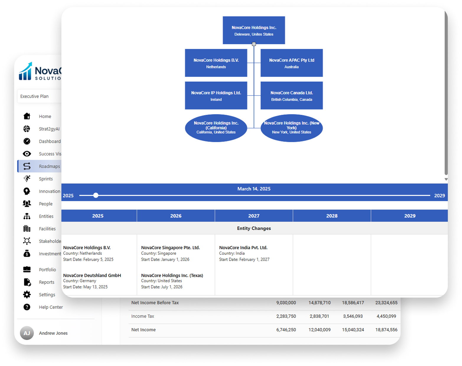 Integration isn’t only strategic, it’s operational. Strat2gyAI provides a single view to plan and track the consolidation of facilities, legal entities, systems, and shared services. Leaders gain visibility into costs, overlaps, and dependencies, ensuring the merged organization operates as one. This structured approach prevents inefficiencies, accelerates integration, and unlocks lasting operational value.